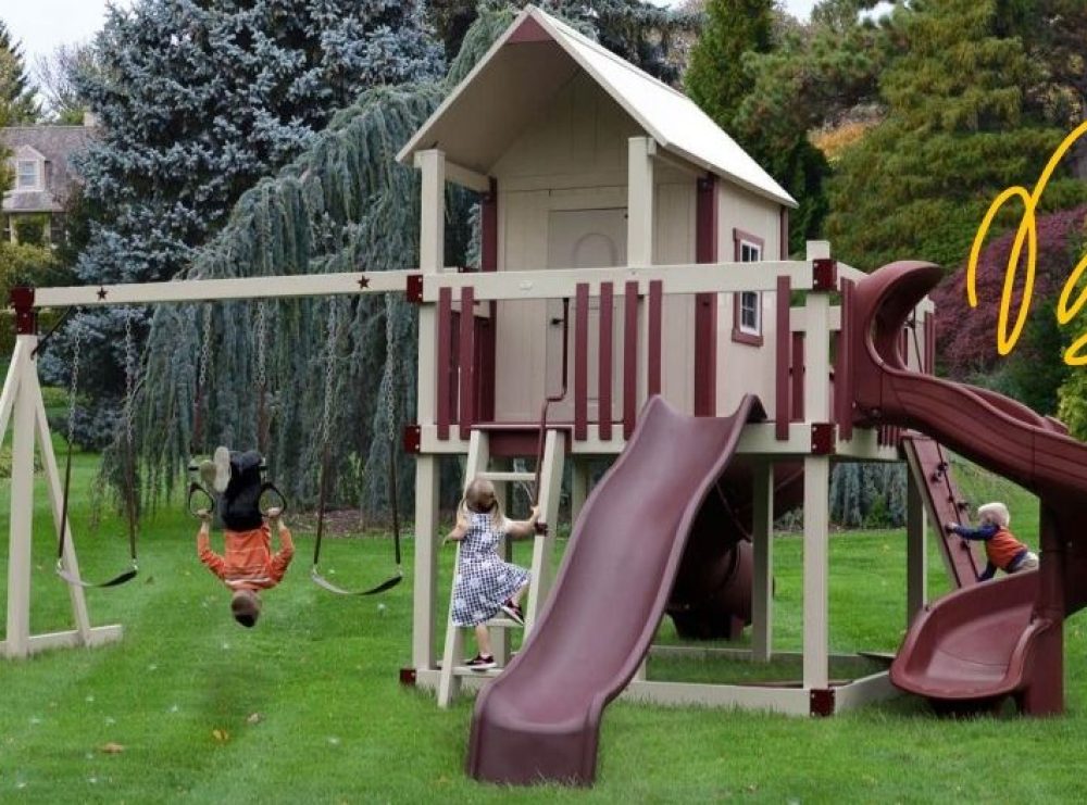 This mansion of a swingset tower features a wrap-around porch and a 5×5 playhouse.