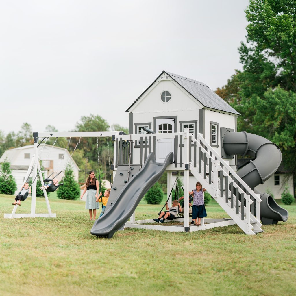 This is where the magic happens. A white playhouse with a black roof looks crisp and modern. A tan playhouse with tan roof feels warm and inviting. Or go bold with gray walls and a red slide that really stands out. The combinations are endless, and your kids will feel like their playhouse was made just for them.