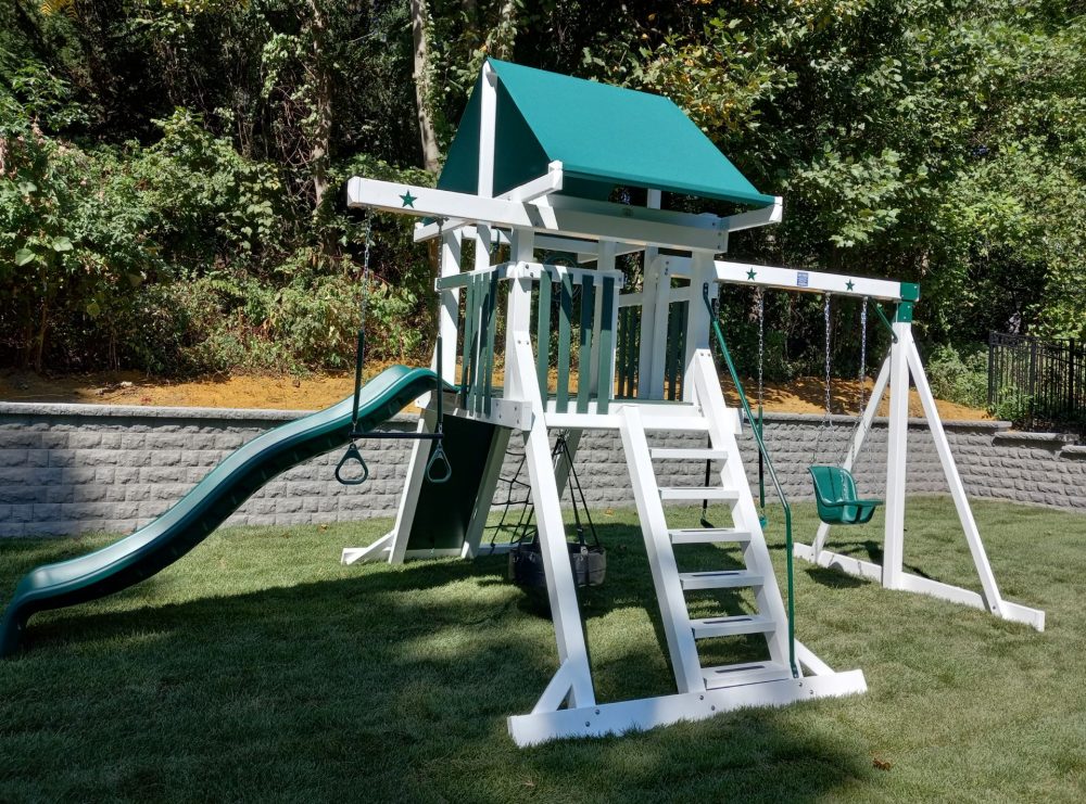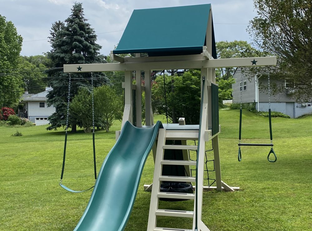 This tower is very popular with families year in and year out. It allows for lots of accessories to be added, while also having a perfect spot for a tire swing underneath!