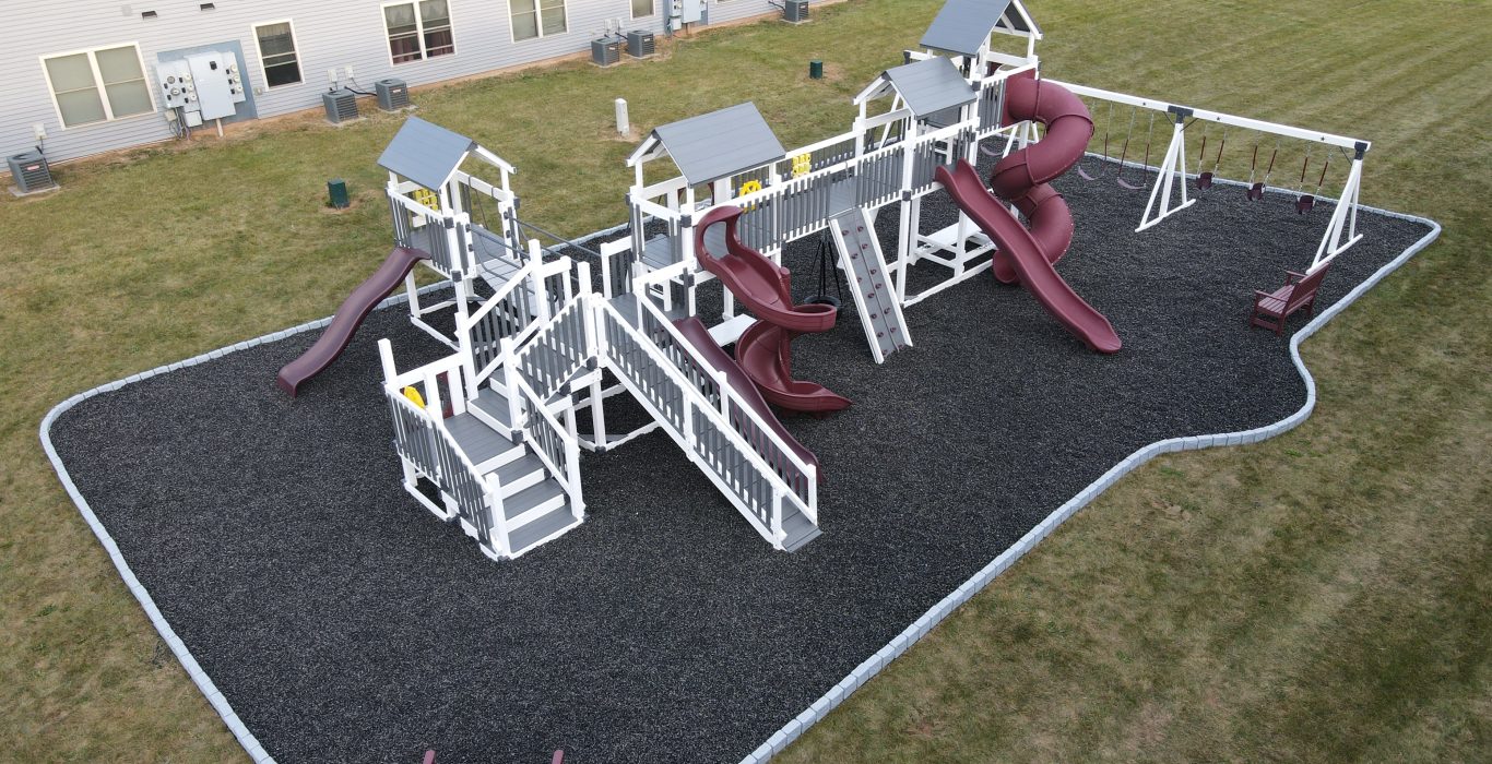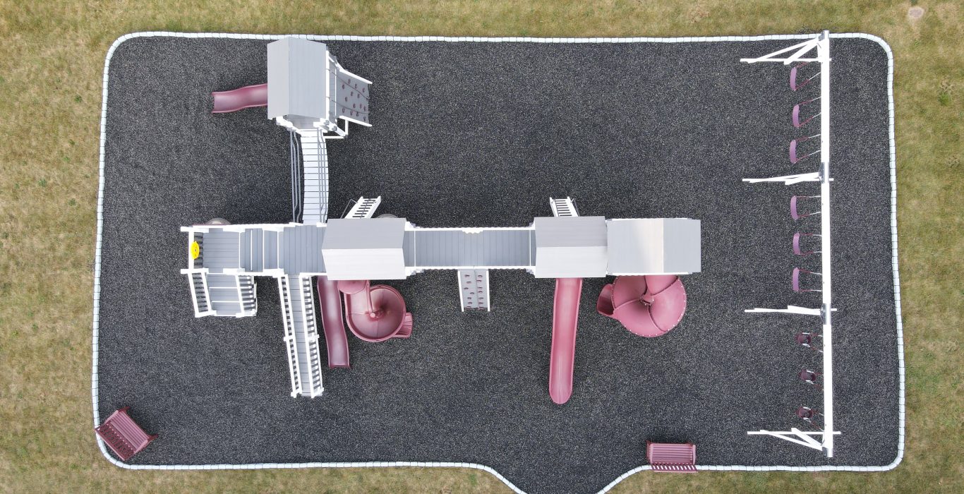 This massive structure features three towers, ranging from 5’ to 9’ deck heights, connected by a 4’x10’ bridge and a wobbly bridge for extra adventure. The grand staircase, two 7’ entrance ladders with handrails, and a 12’ ramp with poly rails make it easy for kids of all ages to explore safely.