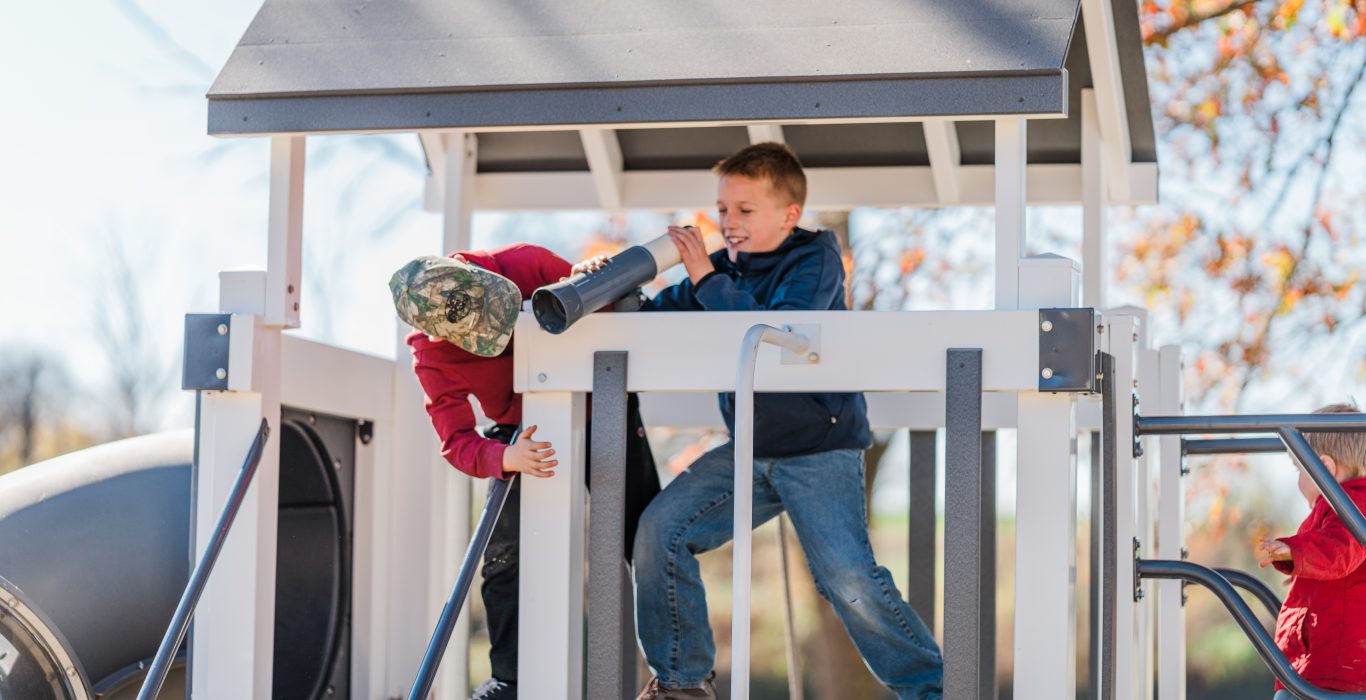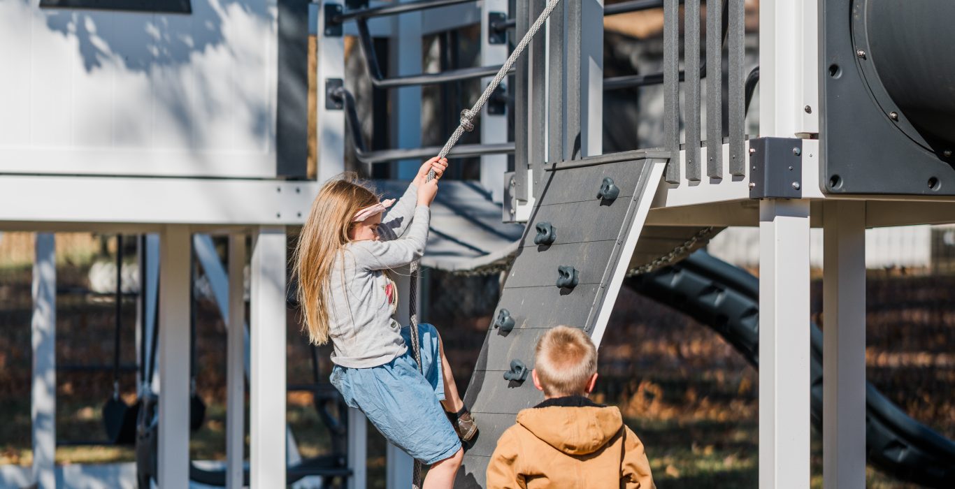 Your kids can climb the 5’ rock wall or head up the stairs with poly handrails (a favorite for younger ones), then cross the wobbly bridge that connects the playhouse and tower. From there, the fun only multiplies — two slides give them the choice between a smooth ride down the 10’ Wonder Wave or the twist of the 5’ Sidewinder with a clear section.