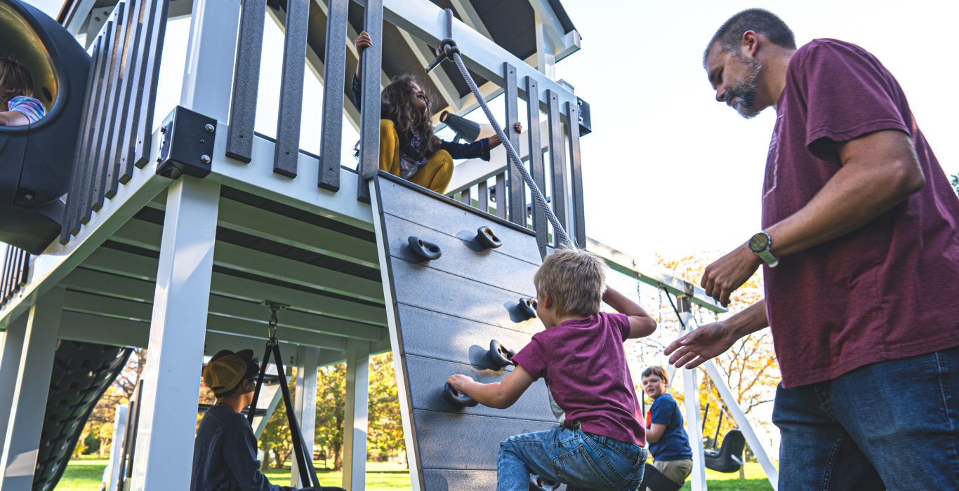 We’ve added a 6’ x 6’ vinyl roof over the tower, so they’ll have a shady spot to cool off on sunny days. Getting up is easy with the 5’ stairs and poly handrails, or your kids can challenge themselves with the 5’ rock wall. Coming down is where the real fun begins — they’ll have the choice of a 10’ Wonder Wave slide for a smooth ride or a twisty 5’ spiral slide for more excitement.