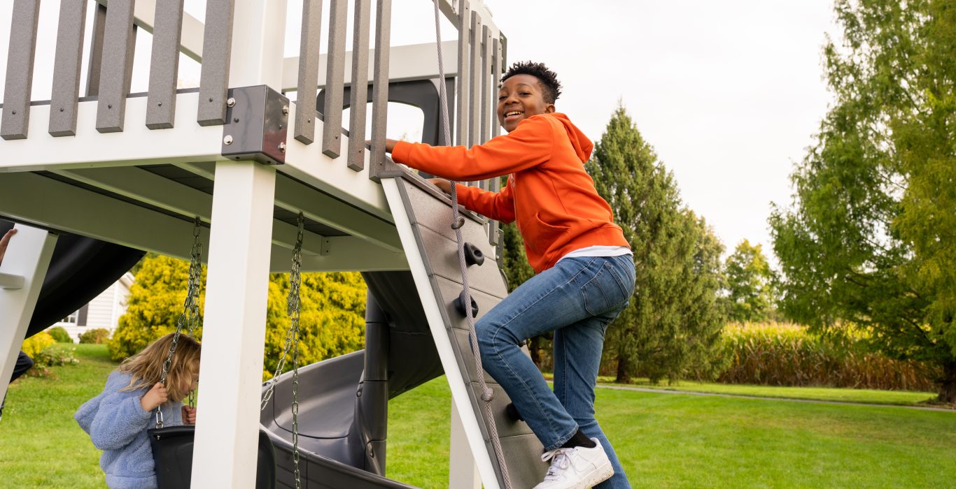 The Star Light has a 4×6 tower that sits 6 feet in the air. That’s a little taller than our standard 5-foot towers, which means you can add some bigger, more exciting pieces to it. The extra height makes room for a longer 12’ avalanche slide, a twisty 6’ spiral slide, and even a taller swing beam so the swings really get moving.